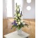 A striking arrangement of white Roses and cream Lisianthus with Veronica, Trachelium and Aconitum providing a touch of blue.